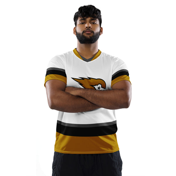 Looking for the perfect sports jersey? We have you covered—made of 100% recycled polyester fabric, this shirt is breathable, moisture-wicking, and has a double-layered v-neck collar that creates a premium look.