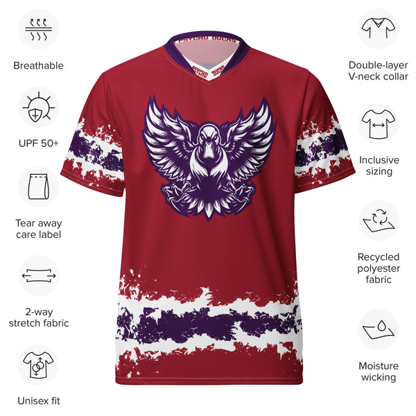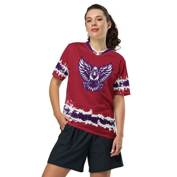Looking for the perfect sports jersey? We have you covered—made of 100% recycled polyester fabric, this shirt is breathable, moisture-wicking, and has a double-layered v-neck collar that creates a premium look.